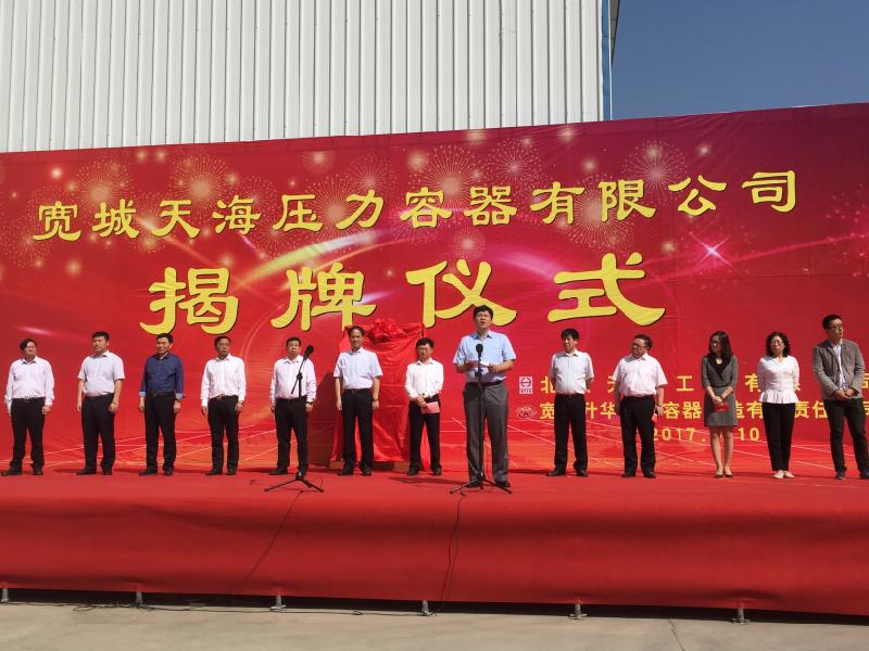 5月10號(hào),寬城天海壓力容器有限公司舉行揭牌儀式。揭牌儀式由寬城縣縣長(zhǎng)楊海龍主持,控股公司總經(jīng)理王國(guó)華,副總經(jīng)理王軍和寬城縣委書記祁海東等寬城縣四大領(lǐng)導(dǎo)班子主要領(lǐng)導(dǎo)出席了揭牌儀式。
